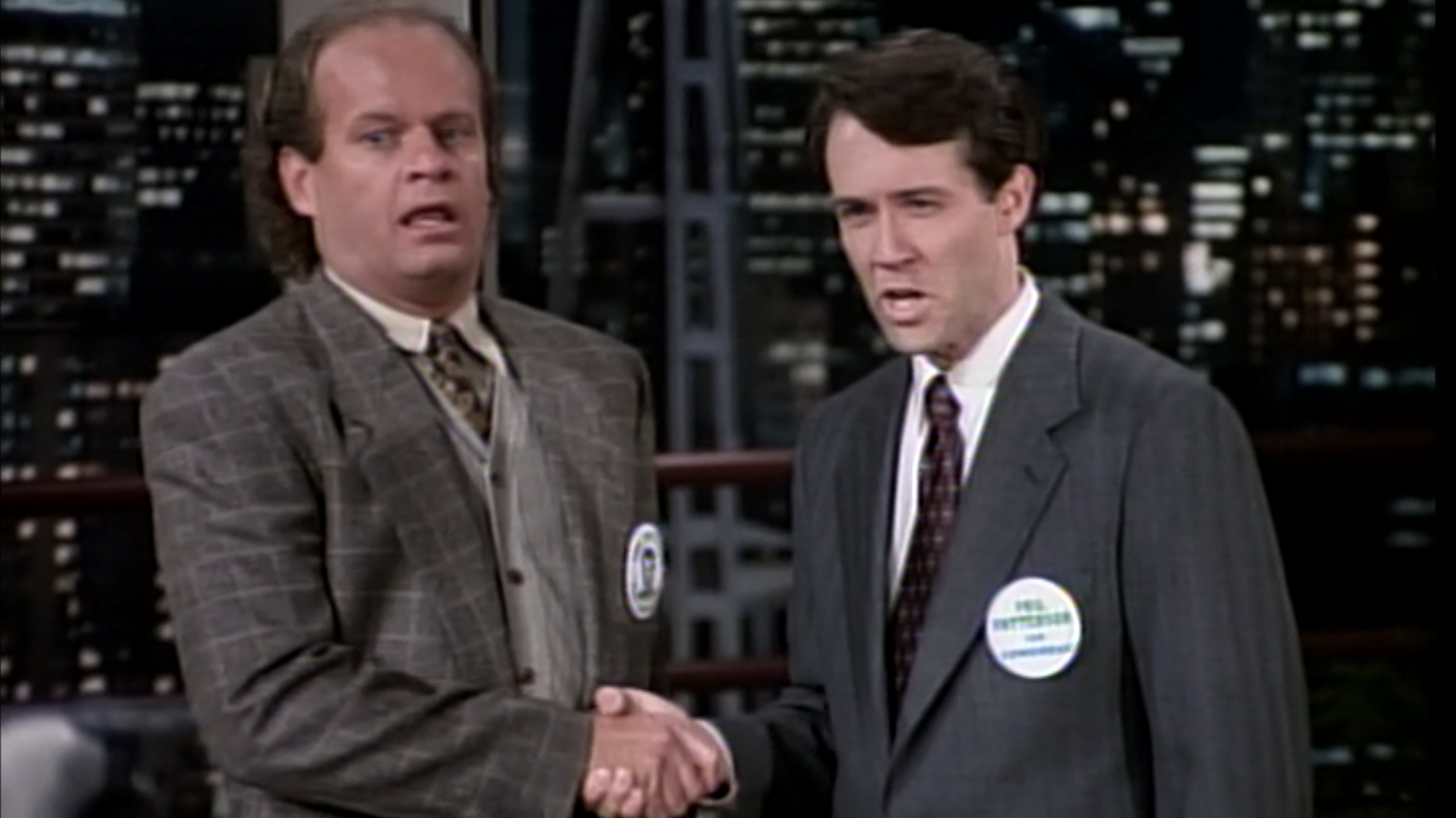 Grammer, however, was merely an actor playing a role, not an auteur who determined the direction of the series. There is also an ideological gap between Grammer and Frasier, unlike the identity between Roseanne and Roseanne. The show explicitly established, in the season two episode “The Candidate,” that Frasier and Niles are liberals. In that episode, they clash with their father over a local election. Père Crane supports a right-wing “law and order” candidate, while the sons are enamored his liberal opponent, who, unfortunately, turns out to be a believer in alien visitation. The episode seems like an uncanny anticipation of left-leaning Democrat Dennis Kucinich, who has long maintained that he once spotted an alien vessel. (“It’s an unidentified flying object—it’s unidentified!” he protested, haplessly, at the 2007 Democratic primary debate.)