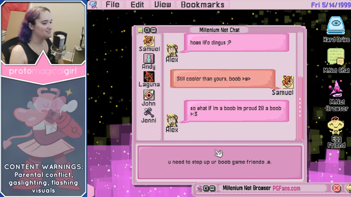 Start up Secret Little Haven and you’ll be starting up your computer, a sticky-sweet facsimile of the Unix box that you might have logged into if you were coming of age sometime in the late nineties. Alex—the character you’re playing—has spent no small amount of time or love in turning the computer environment into a teenage girl’s bedroom, bubblegum pink taskbars and all, but they don’t seem to realize it yet.  Alex’s desires are found on the Internet, and on the Internet they take the form of early fandom, specifically around a Sailor Moon-esque magical girl anime. An online friend gives you the latest from the rumor mill: In the feature film that’s coming soon, Minori will *finally* be initiated to the Love Force, and will be able to transform with feminine elemental power like they do, but Minori is a boy.