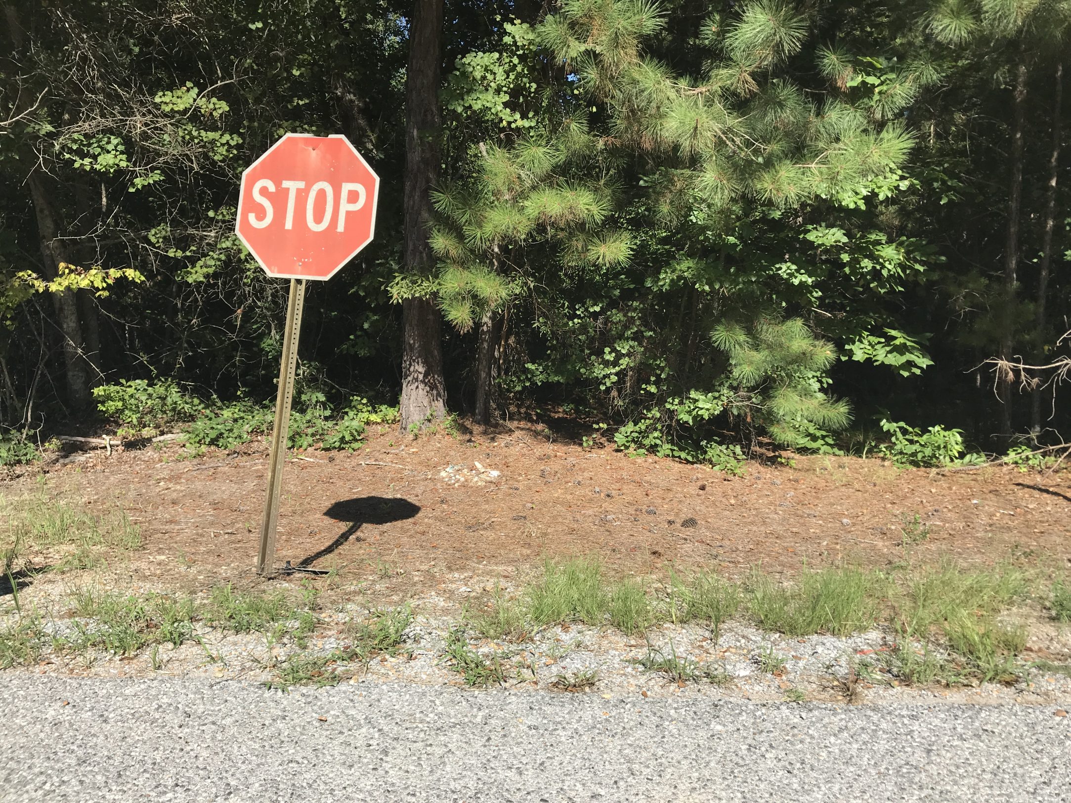The place itself is just a bit off the highway, at the junction of 515 and 284. A clearing where one lane through the woods empties into another. Pine needles, gravel. An off-kilter stop sign. Another friend, who grew up in the area, later sees my photographs and says it doesn’t feel quite right—the precise site may be some further short distance away. Or not.