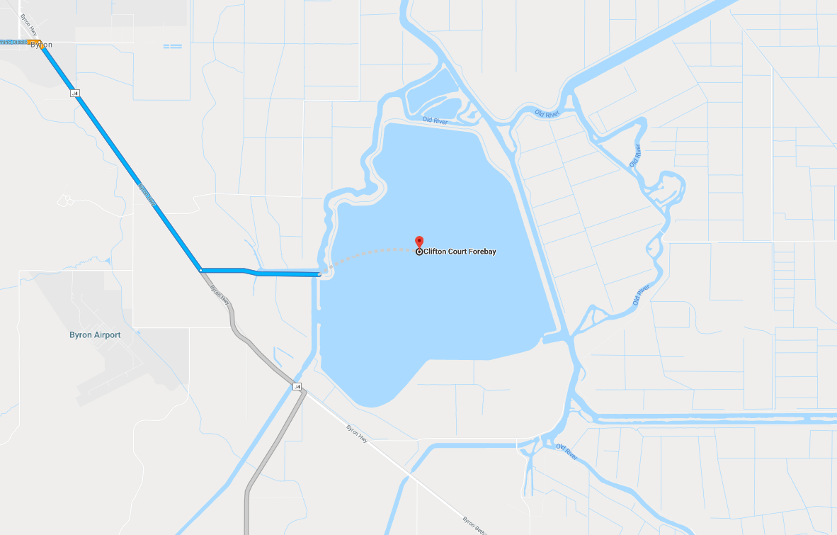 According to Google Maps, Clifton Court Forebay should be easy enough to get to. If you type in that name, as I did, you will be instructed to take the Byron highway down from Antioch, to turn off on Clifton Court Road—a paved, but markedly smaller side lane—and drive your gas-propelled vehicle past the Lazy M Marina until you reach an ad hoc parking lot. At this point, Google helpfully suggests that you take to the air for a dotted-line-leap to the center of your final destination, an artificial body of water at the center of the massive system of irrigation that makes California possible.