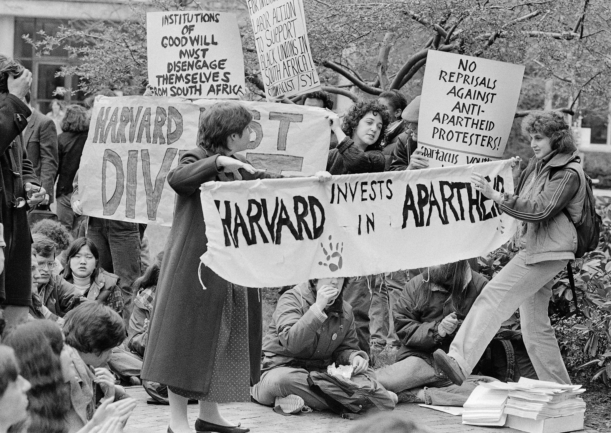 Students put up signs outside the official residence of the president of Harvard University on April 25, 1985. (AP Photo/Charles Krupa)