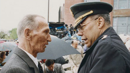 Jan Karski and General Colin Powell meet during the opening ceremonies of the US Holocaust Memorial MuseumPublic domain via Wikimedia Commons