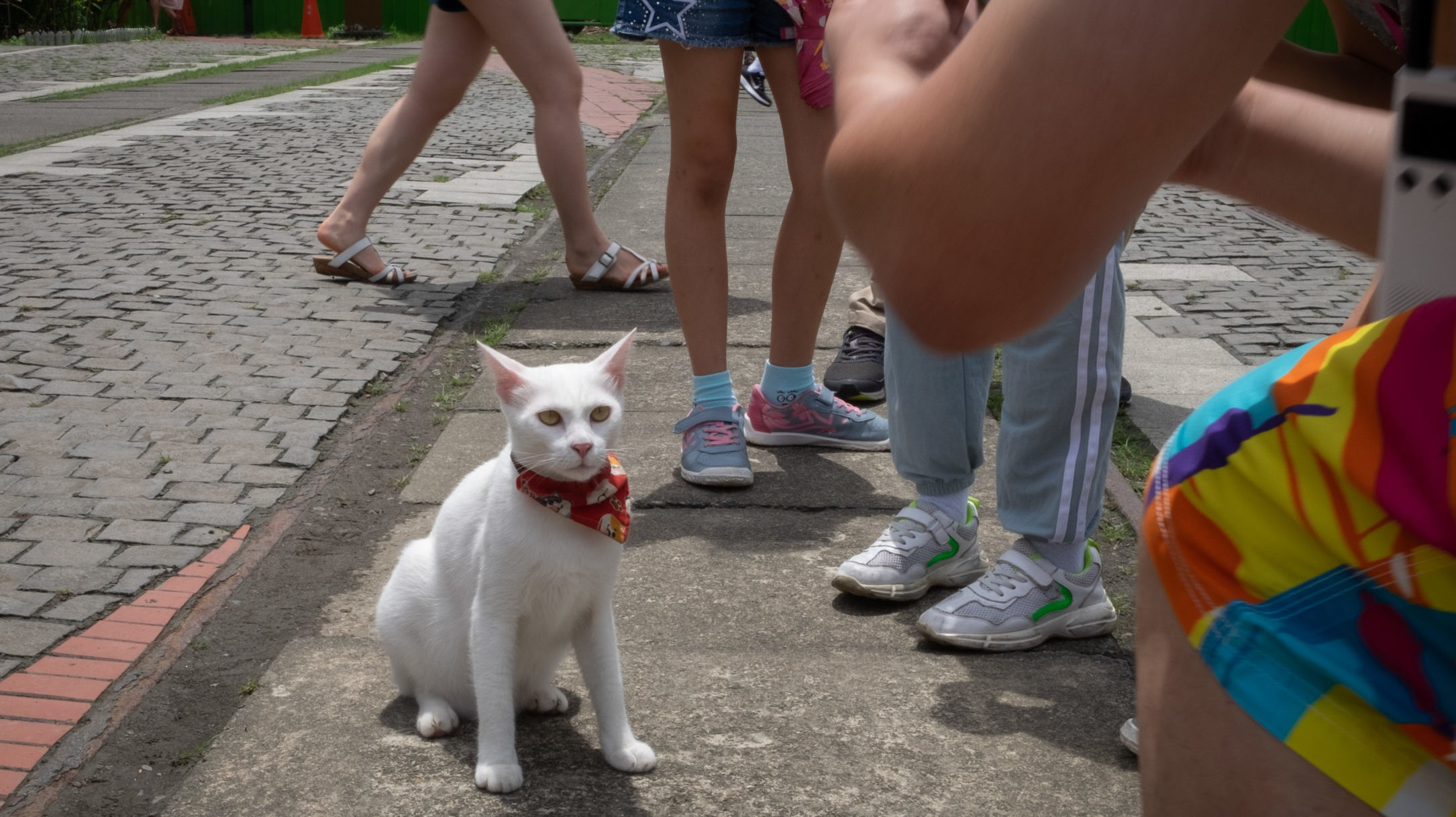 The sun beat down on the hot concrete. I wiped the sweat off my forehead with one hand, camera in the other hand, as I watched a gaggle of tourists clustered around an elegant white cat in a kerchief collar. A child was feeding it, spooning bits of meat gingerly out of the tin. The cat accepted these nervous offerings imperturbably; it couldn’t have cared less about the humans cooing over it.