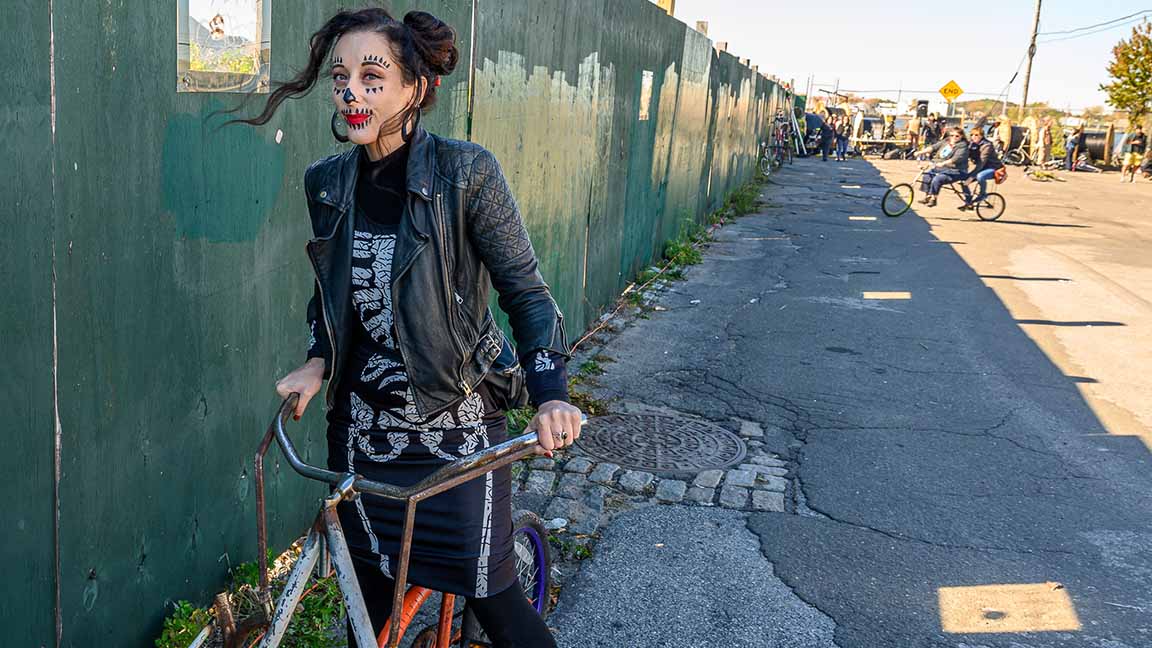 Everyone began to fall over with more frequency. Jeff went for a spin and came back, his suit and tie intact but his white facepaint a little smudged, breathing hard. “Just got in a six-bike pileup,” he said, straightening his hat. He and Chelsea had brought a huge pot of soup, ladling it out with chunks of bread. Someone else made soup too, and some chai; there were tamales, pork dumplings, fancy cheese wheels of indeterminate provenance. I carried food over to Tod, dodging bikes, leaping to the side to escape a near crash, laughing with relief when I made it across the double lane of traffic.