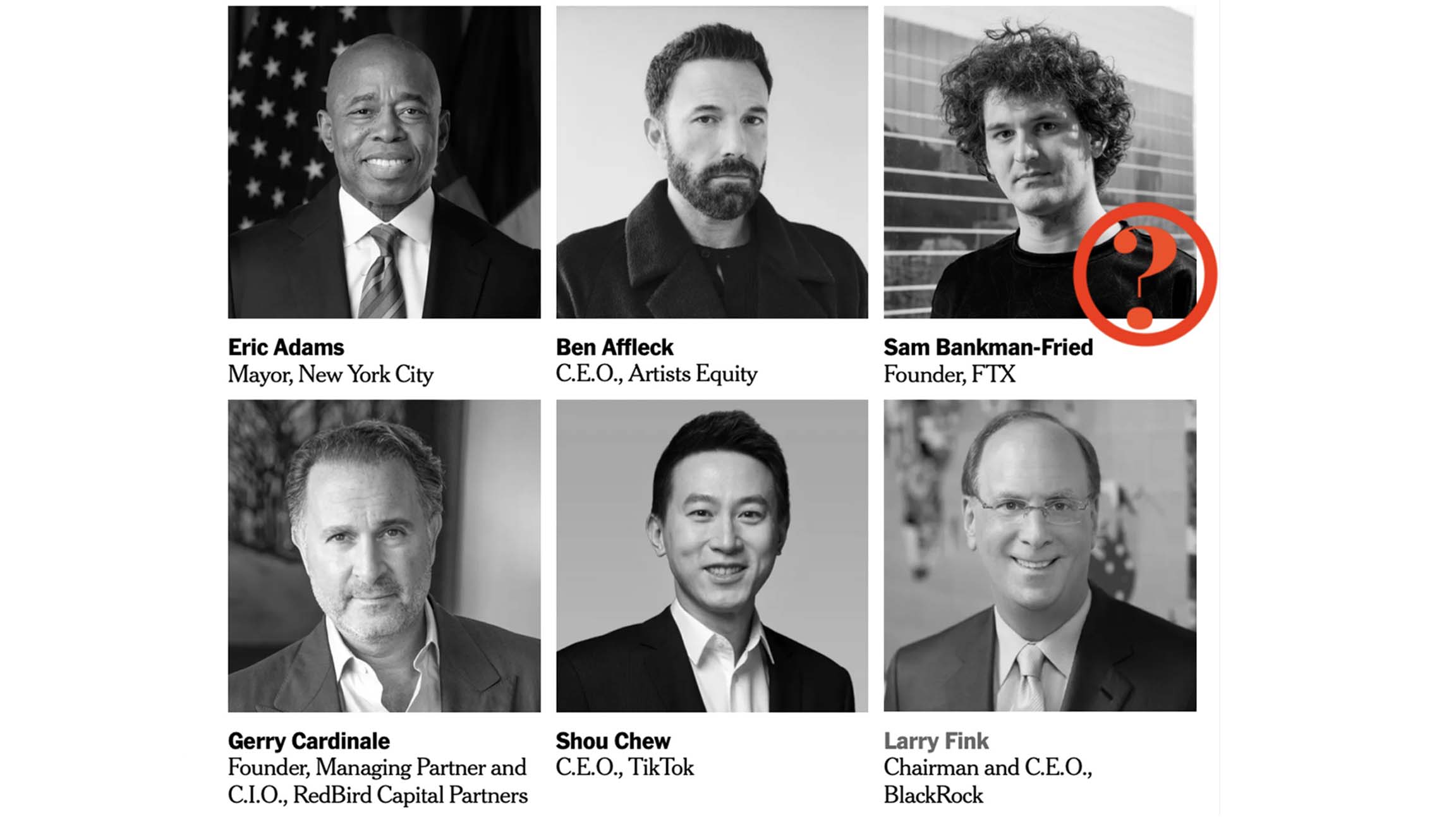 Last month, The New York Times’s DealBook newsletter promised that anyone willing to buy a $2,499 ticket for the 2022 DealBook Summit (if their application is accepted), to be held on November 30 at Lincoln Center, could take in “a series of conversations with the biggest newsmakers in the world of business, politics, and culture.” In the intervening weeks, one of the speakers on the announced lineup more than lived up to the promise of making big news: the cryptocurrency celebrity and FTX founder Sam Bankman-Fried. Originally second-billed behind the likes of Treasury Secretary Janet Yellen, Ukraine President Volodymyr Zelensky, and Meta CEO Mark Zuckerberg, Bankman-Fried has become an object of fascination and derision after the FTX fiasco and ensuing bankruptcy evaporated what had recently been a $32 billion business and led to calls for his prosecution for fraud. Still, there is his headshot atop the grid of “today’s most vital minds,” standing out like Rumpelstiltskin trying to hide in a haystack.
