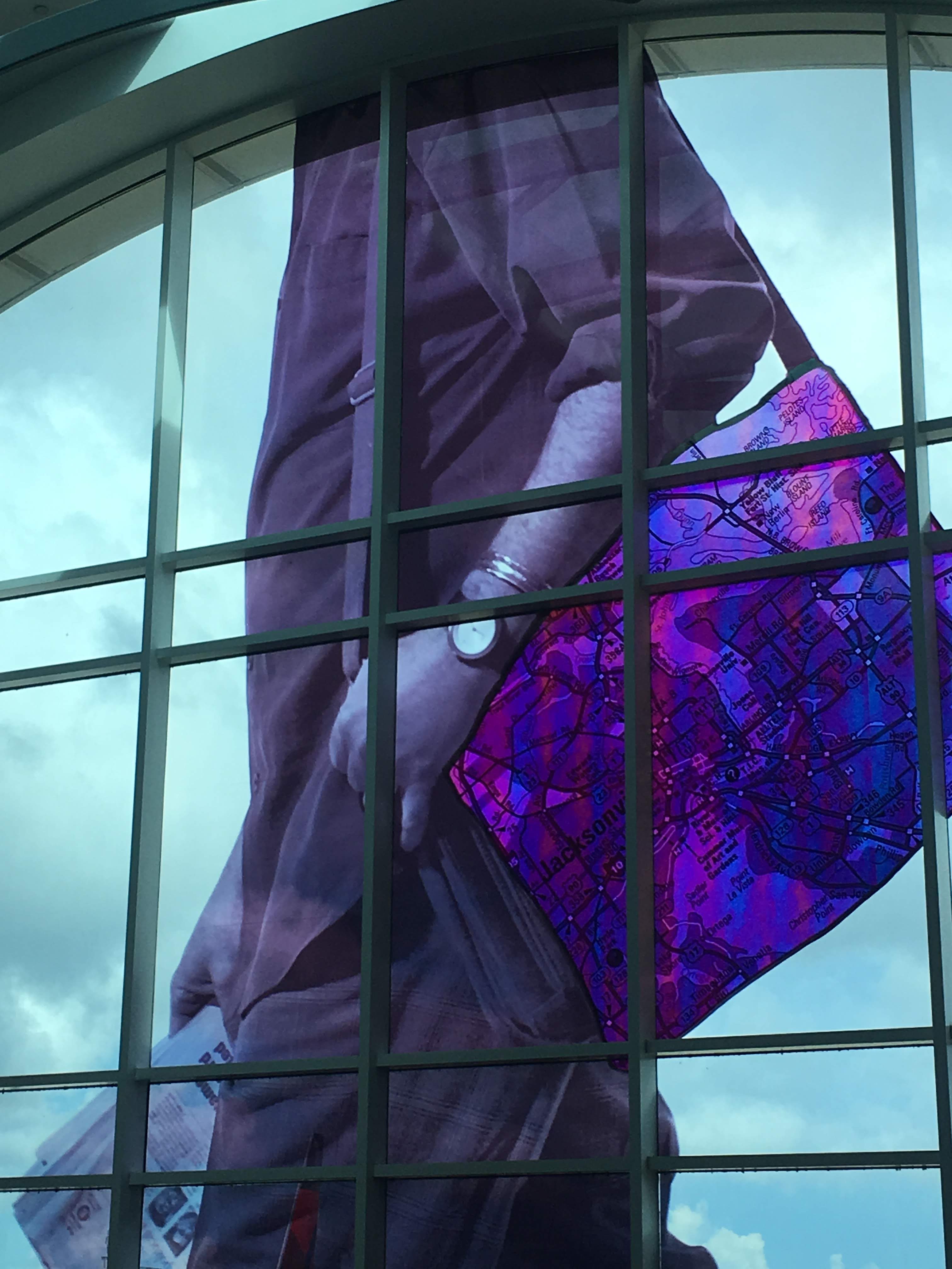 Looming at the end of each concourse are two of the most ridiculous examples of airport art I’ve ever seen. Thirty-five feet high and wide, Concourse A features a photorealistic picture of a man mid-stride, shown from shoulder to calf, wearing a watch and a bracelet, holding a newspaper in one hand and carrying a messenger bag decorated with a road map of Jacksonville (???????) on the other shoulder. Such a casual stride, this towering man has—he’s definitely not late for his flight.