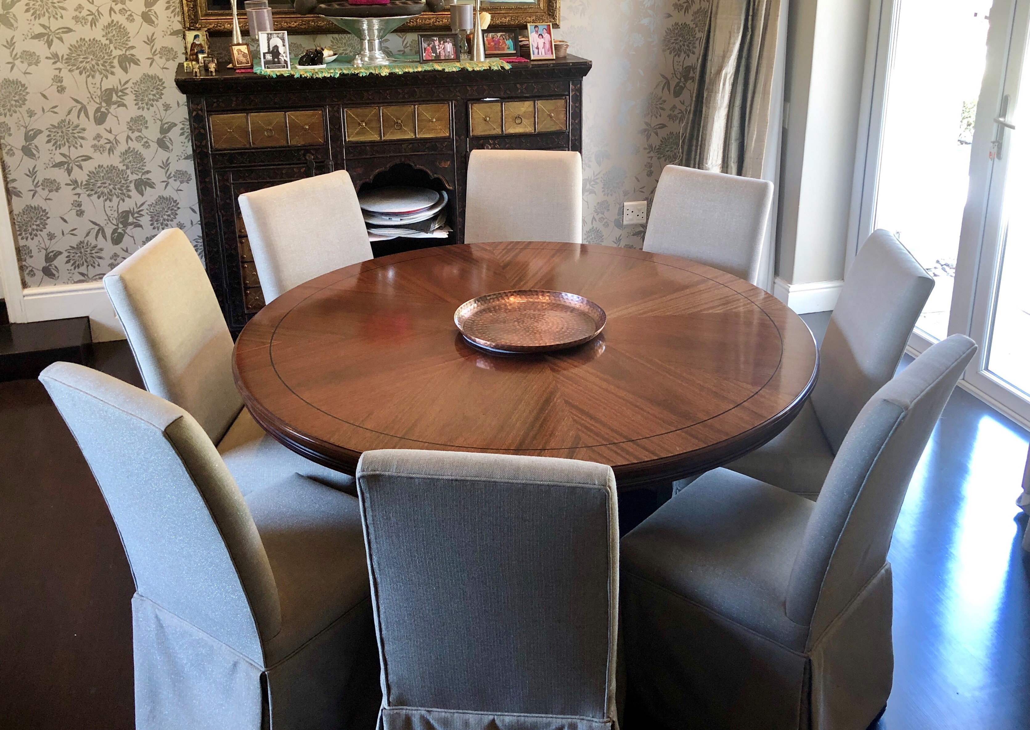 We felt like conspiratorial knights by ordering a round dining room table: its handsome surface echoed the inlaid grain and gleam of a Louis XV replica, painstakingly crafted but modernized sans the Rococo flamboyance. A good table to lay a feast upon. It seated eight.