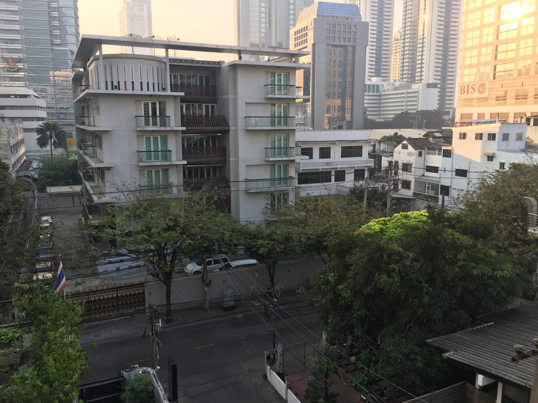 My parents picked me up from the airport. I didn’t pick stupid fights with them in the car. When we got home, I looked out my south-facing window onto the verdant, wire-crossed street I know so well. It was shocking to me that another country could be on the flip side of a flight. This has always been shocking. I just know how to register it now. It was 7 a.m. in Bangkok, and the light was coming off the east-facing glass of the buildings rising around me.