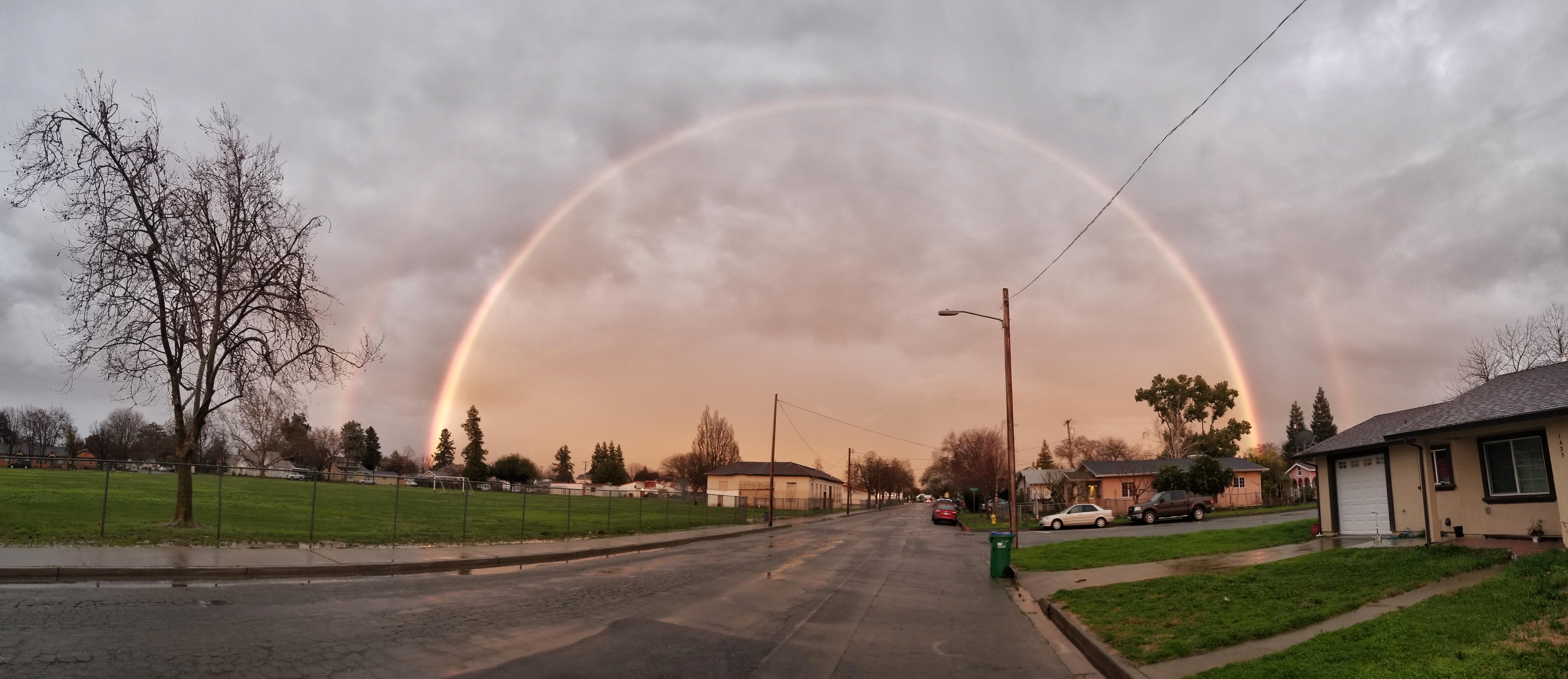 In Gridley, a flat farm town with lots of stucco bungalows, stood a curious place of business, neither clearly alive nor dead, called “The Kid’s Castle.” It stopped raining. Tor pulled over and showed me two possible routes on his phone. I said either. He picked one which meant we’d need to backtrack a bit. The second we turned around, we found ourselves looking at the most enormous double rainbow. Truly one end of it seemed to be in Chico and the other back in Marysville. The outside rainbow was faint, but the inside one vivid and saturated with color. There was a misty quality only at its very top. The rest of it seemed to have been drawn with a child’s markers.