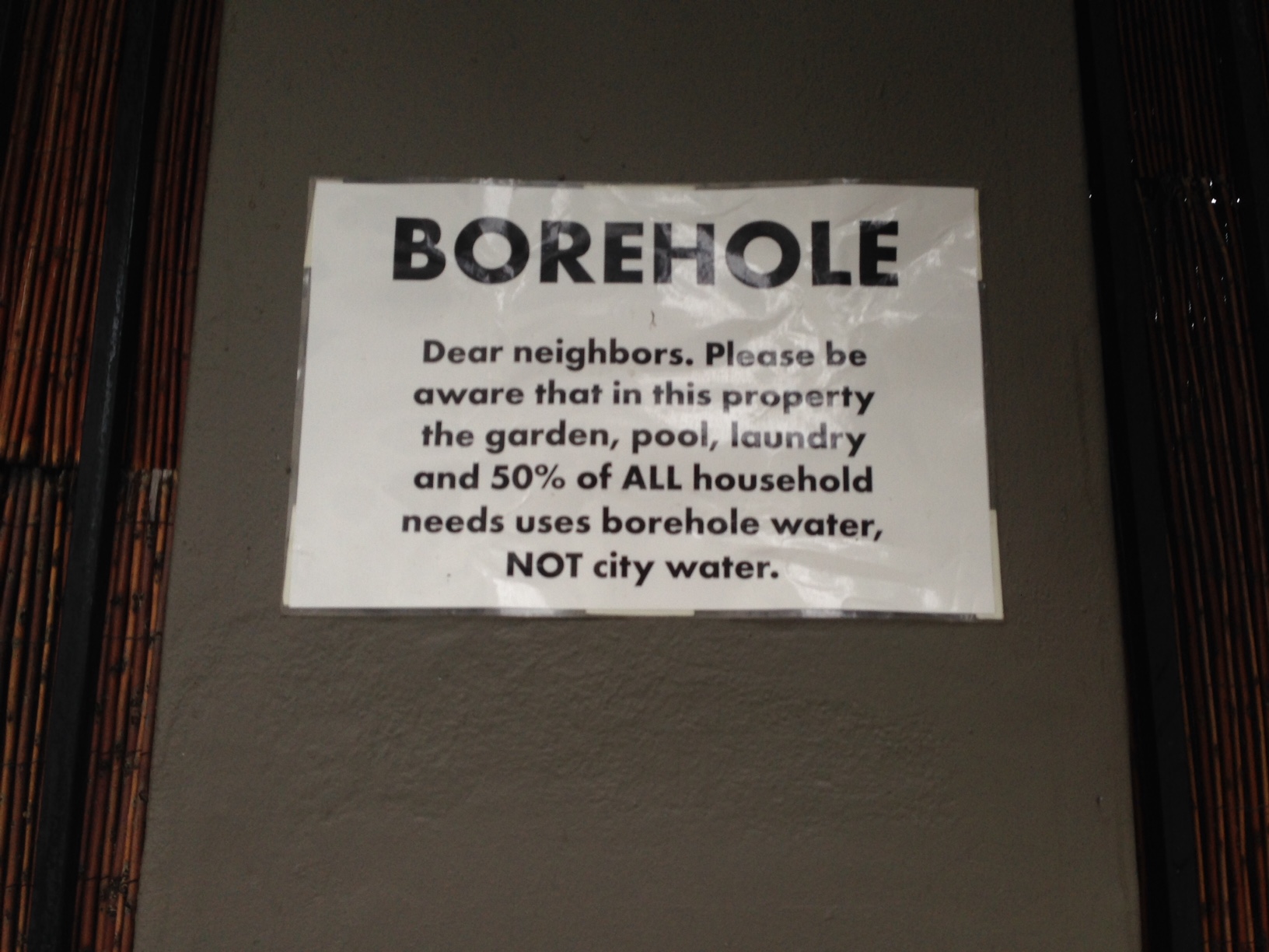 This is all to the good, obviously. Obviously. This is of the most critical importance, and there is absolutely no other way to respond. It does tend to bring out the sanctimonious side of a person, however. You can’t just install a borehole in your garden in order to ease the demand on the municipal supply. You must also put a sign on your wall outside informing your neighbours of this fact. The sign serves at least two functions: it answers any potentially tricky questions about why the garden is still so green, or why the swimming pool remains full, and it makes the neighbours who can afford to install boreholes but have not yet done so feel very guilty. You have a lot of loud public conversations about greywater-management devices: how easy it is to make the change, how terrible it is to think we used to just flush litres of drinking water down the toilet, how implausible the thought of a long bath is. You think all these things, but you also say them, loudly, a lot.