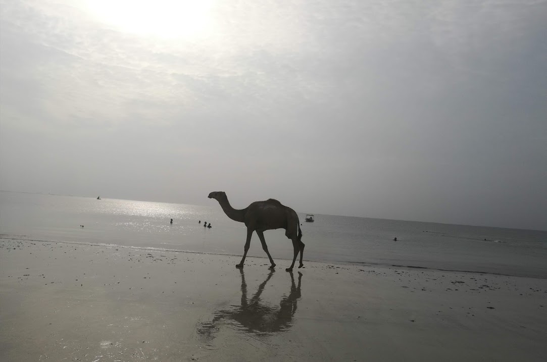 As we were getting out of the water, we saw a camel make its way slowly, and we all stopped to wonder what it was doing there so early.
